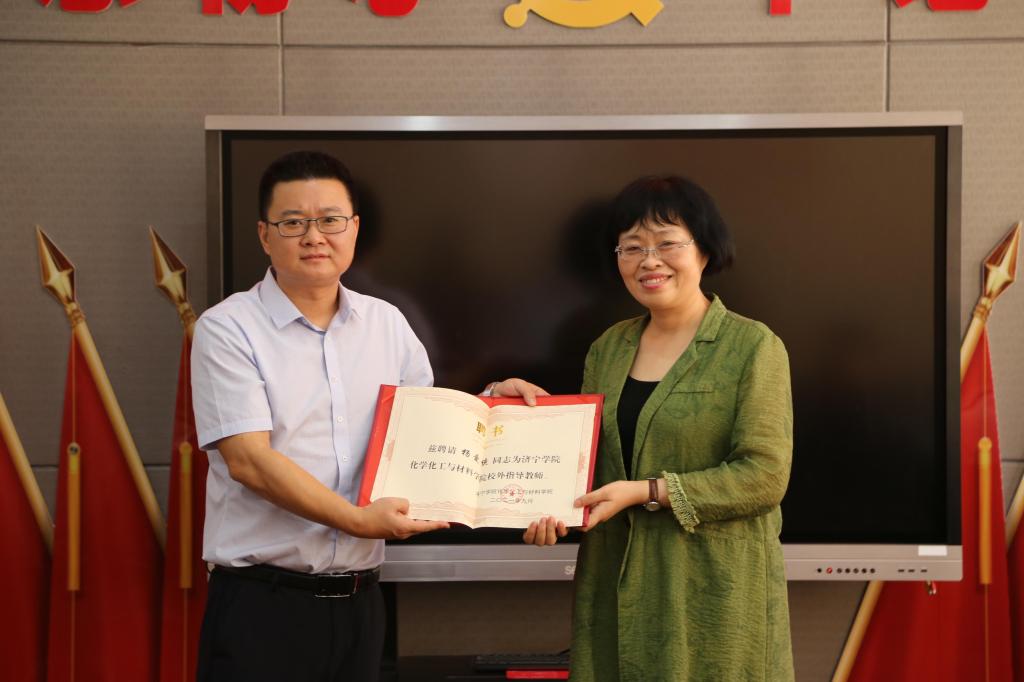 为了更好地开展教育教学合作交流,刘国栋院长为冯昌平校长颁发济宁学院特聘教授聘书,并聘任杨爱侠、刘峰老师为校外指导教师,王慧、王海军、阴晓彤三位老师为兼职教师。