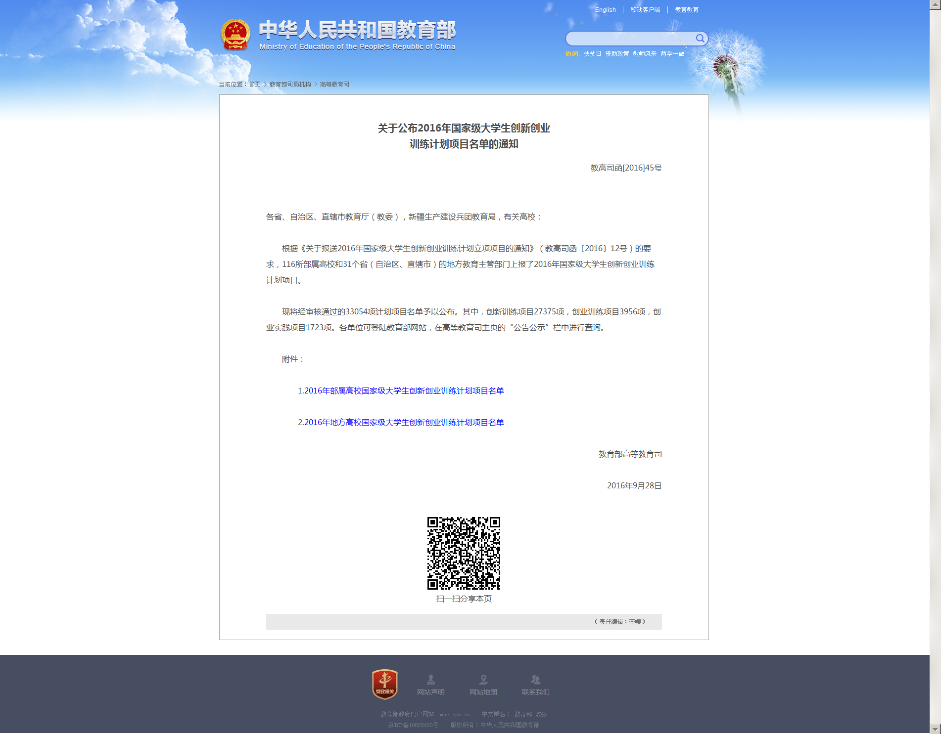 日前,教育部网站公布2016
